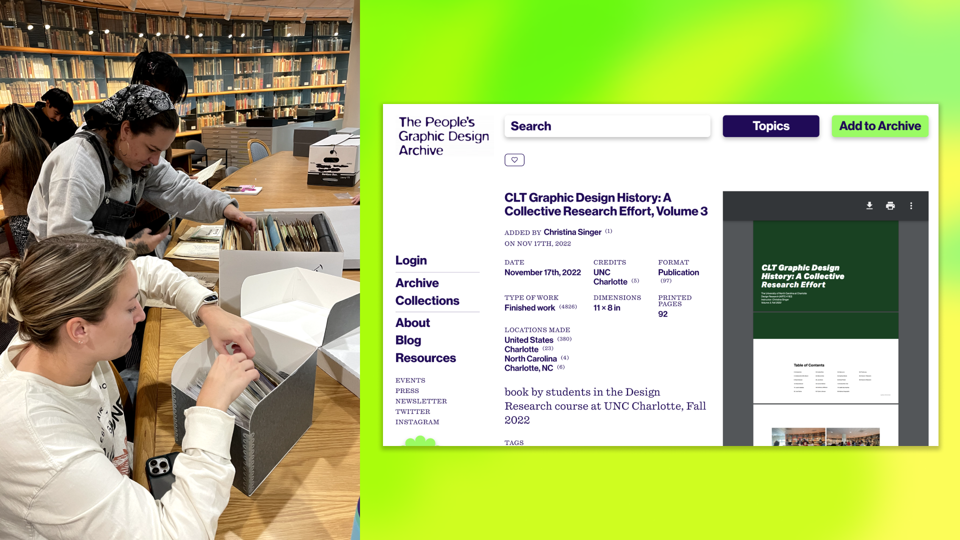 Undergraduate Design Research students at UNC Charlotte have been investigating local graphic design history as part of an ongoing project since Fall 2021. What artifacts do students decide to illuminate, and why?