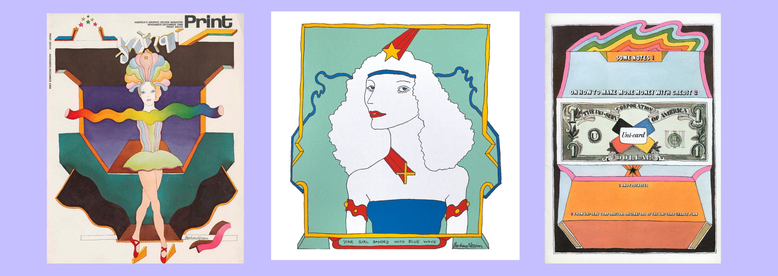 Barbara Nessim, Cover illustration for Print magazine, vol. XXII, 1968.“Star Girl Banded with Blue Wave,” 1966and Booklet for “Uni-Card," 1968