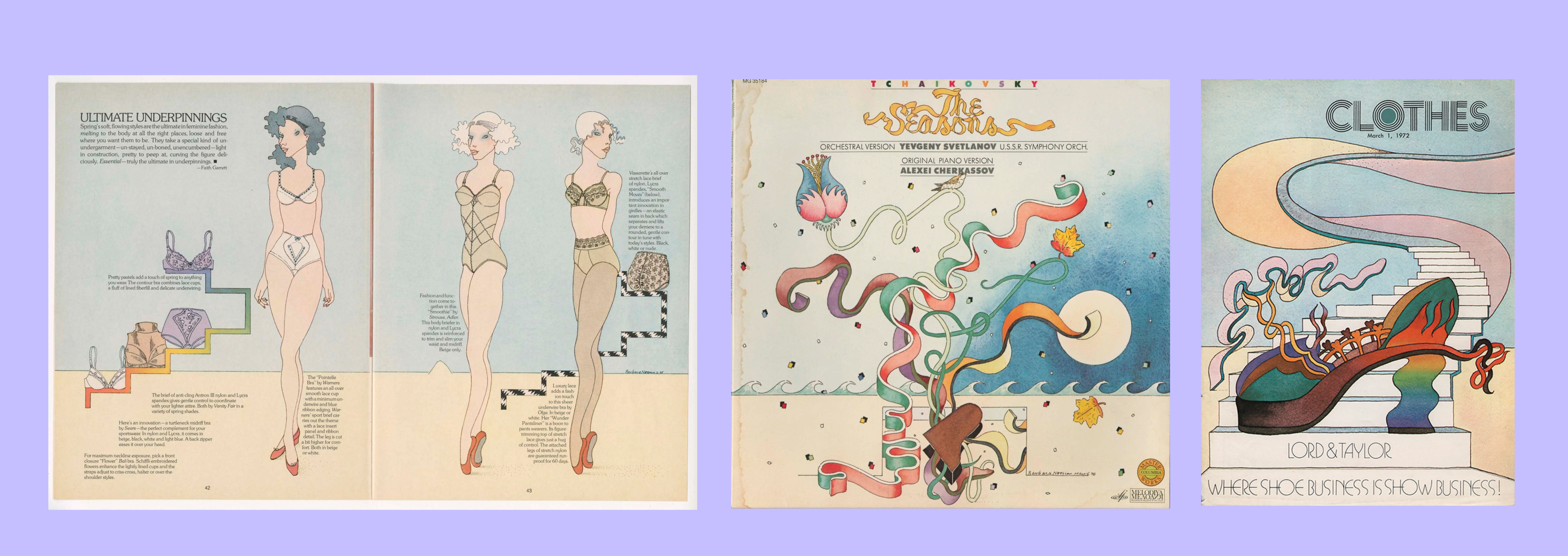 Undergarments illustration from 1975.Tchaikovsky: The Seasons album cover from 1978.and Clothes Magazine Cover from 1972.