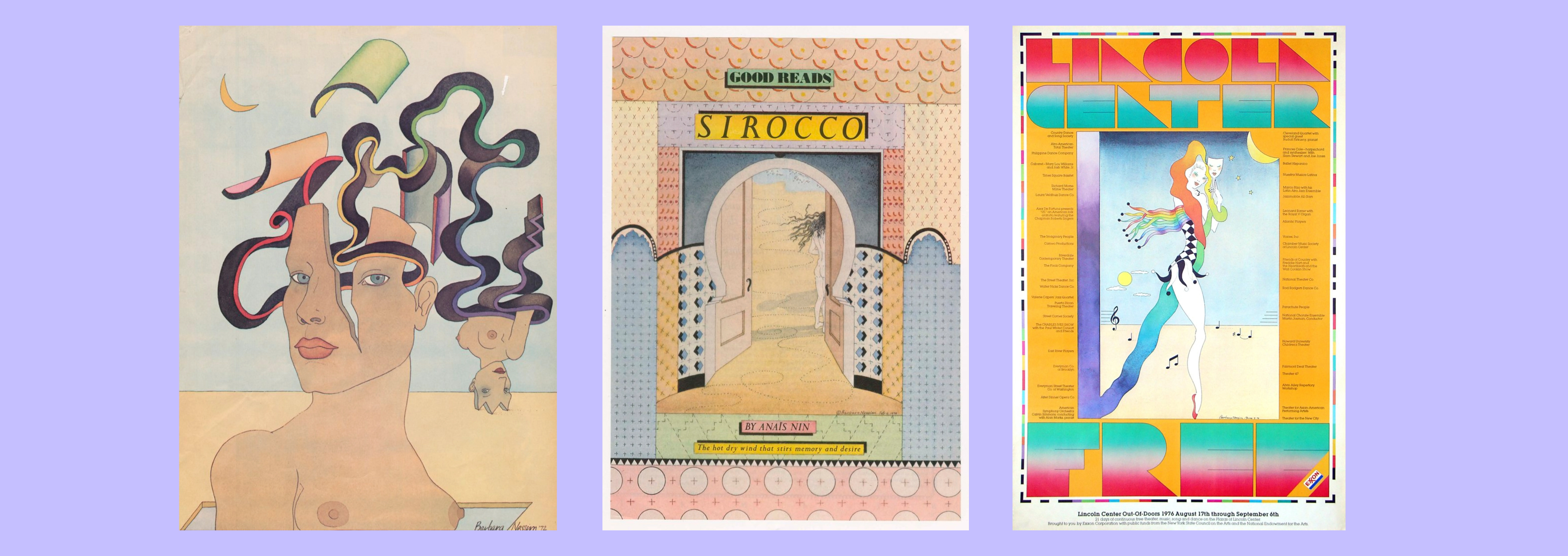 Women and Madness illustration from 1972. SIROCCO book cover from 1979, and Lincoln Center Free illustration from 1976 (Complete poster designed by Katherine Pallidini).