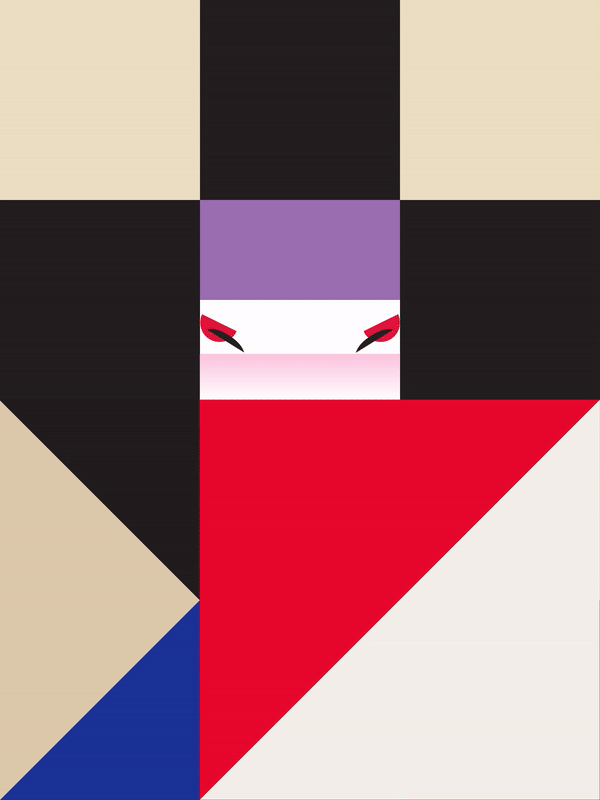 center: Yuka Masamura animated a classic poster by Ikko Tanaka, Nihon Buyo, from 1981