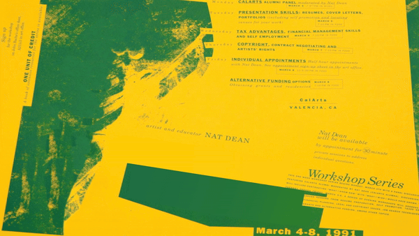 center: Vanessa Perez reimagined a poster by Gail Swanlund from 1991, “Artist Survival Skills.”