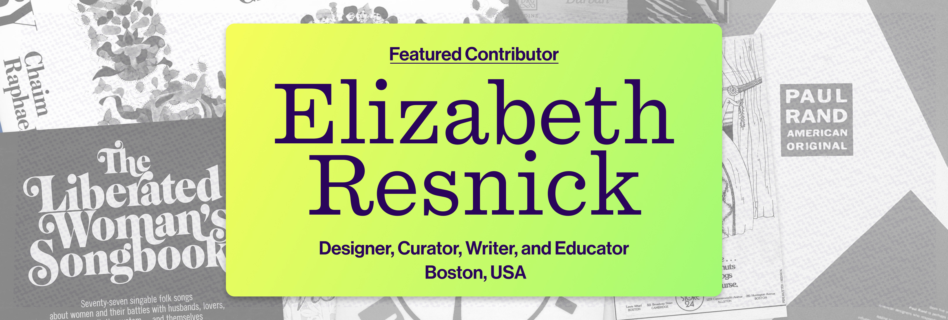 This year The Archive is heading up an interview series with our Frequent Contributors to share insight behind building this compelling and unique collection of graphic design. And with that I would be excited to introduce Elizabeth Resnick as The PGDA’s first Featured Contributor of 2023. Elizabeth is a practicing designer, curator, writer, and design educator at Massachusetts College of Art and Design (Mass Art). She has consistently been uploading design materials to PGDA since hearing about the project through professional colleagues and PGDA Co-Directors, Louise Sandhaus and Brockett Horne. Elizabeth’s efforts expand the mission of graphic design history preservation as told by a collective of diverse working designers, educators, and real people. Elizabeth inspires us to share project credits for archival purposes and to celebrate all the women in the industry who have not received much deserved celebration.