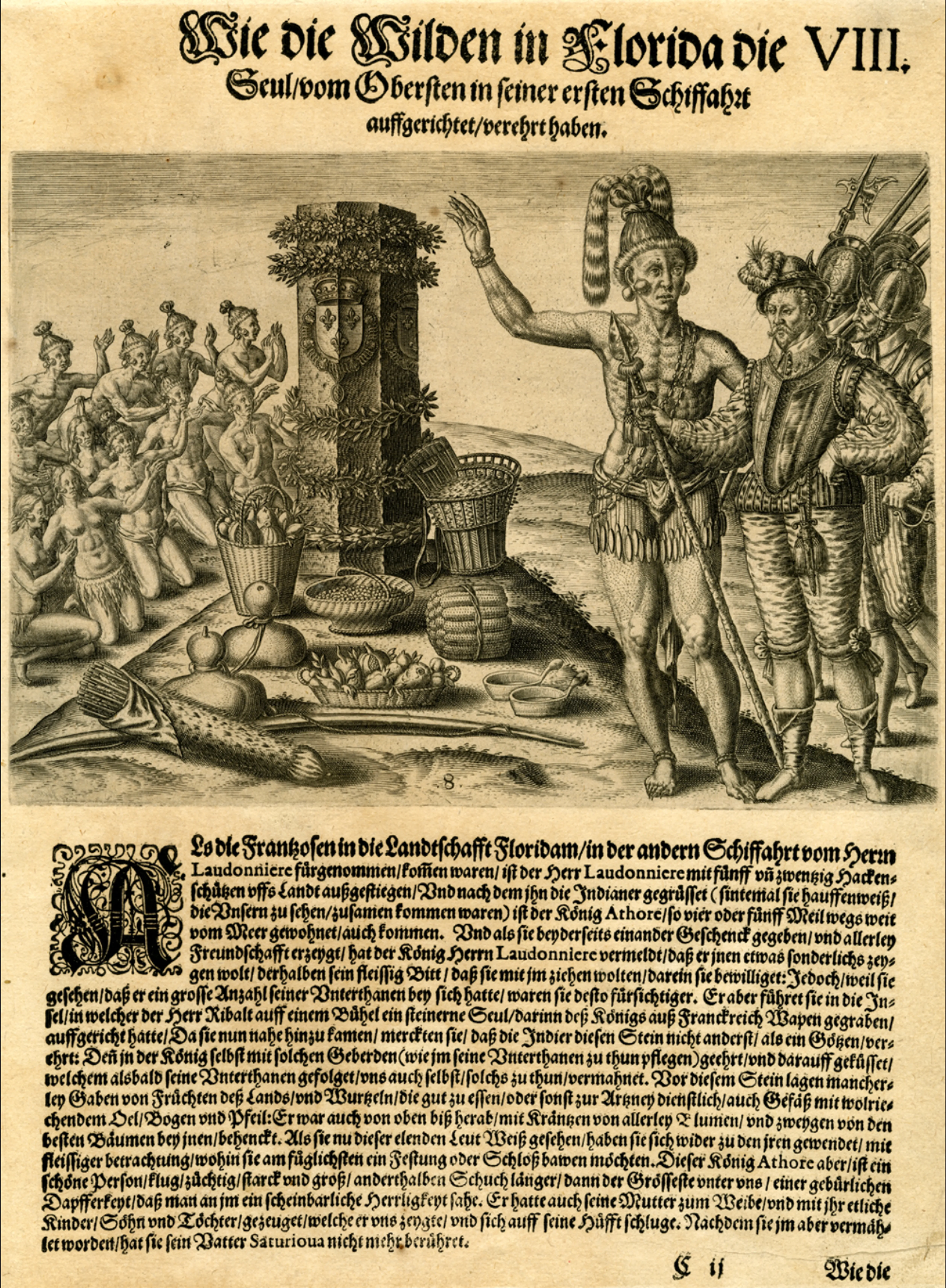 engraving, Indigenous Timucua of Florida experience French attempt to establish settlement in present-day Jacksonville, 1591