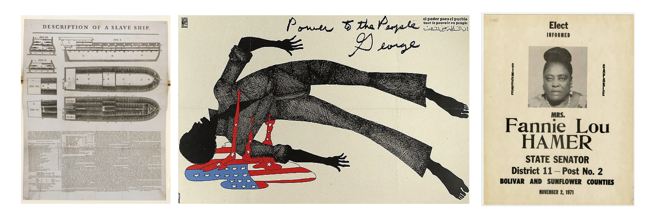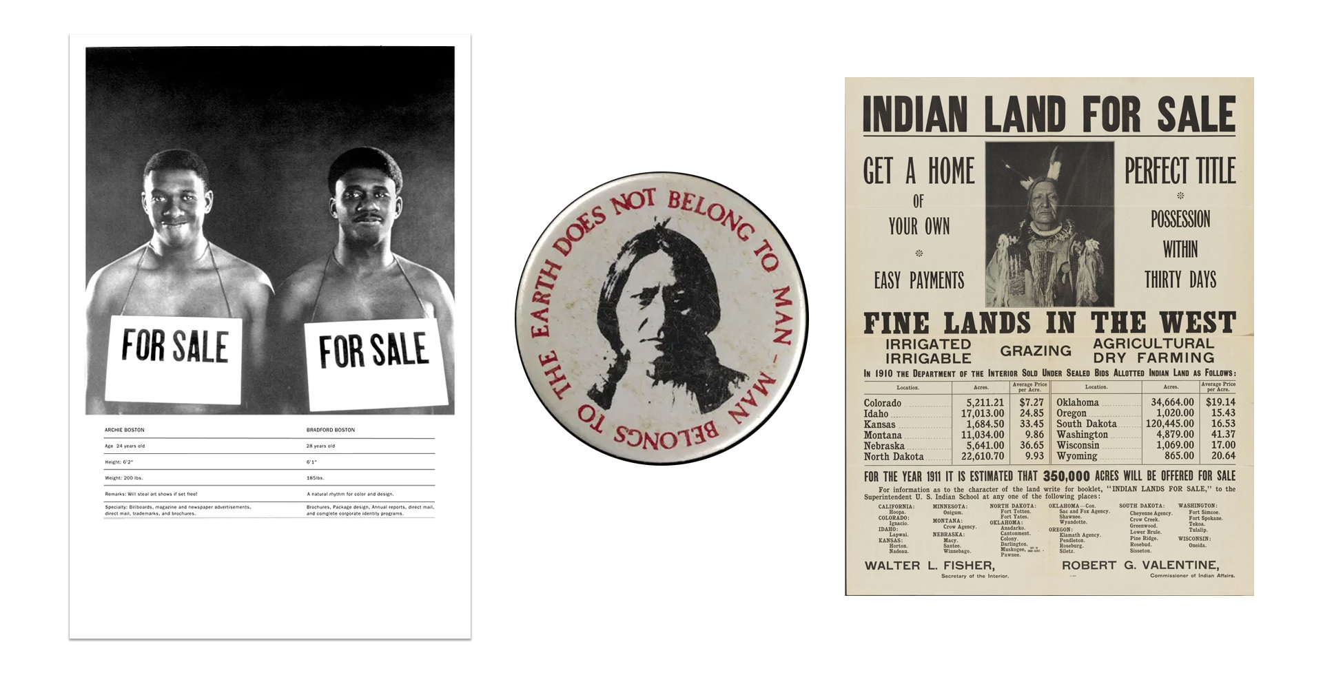 I assembled this collection of design artifacts (see lists below) because they raised questions that stimulated growth rather than answers. What happens when you bring into conversation an influential 18th-century news article depicting the vile and inhumane conditions of slave ships next to a 20th-century ad by Black designers by Bradford and Archie Boston selling their services with “FOR SALE” signs around their necks like slaves on the auction block? What differences in worldview do we have to contend with when we bring into the same room a button with Lakota leader Sitting Bull’s portrait that reads “The Earth Does Not Belong to Man—Man Belongs to the Earth” and a poster circa 1911 proclaiming “Indian Land For Sale” in Colorado, Idaho, Kansas, Montana, Nebraska, North Dakota, Oklahoma, Oregon, South Dakota, Washington, Wisconsin and Wyoming—the very lands Sitting Bull and many others gave their lives to protect? Placed side by side, complex and layered discourses unfold. I encourage others to spend time getting lost in The People’s Graphic Design Archive, to listen for the conversations that emerge, and to not be afraid to follow the trouble.