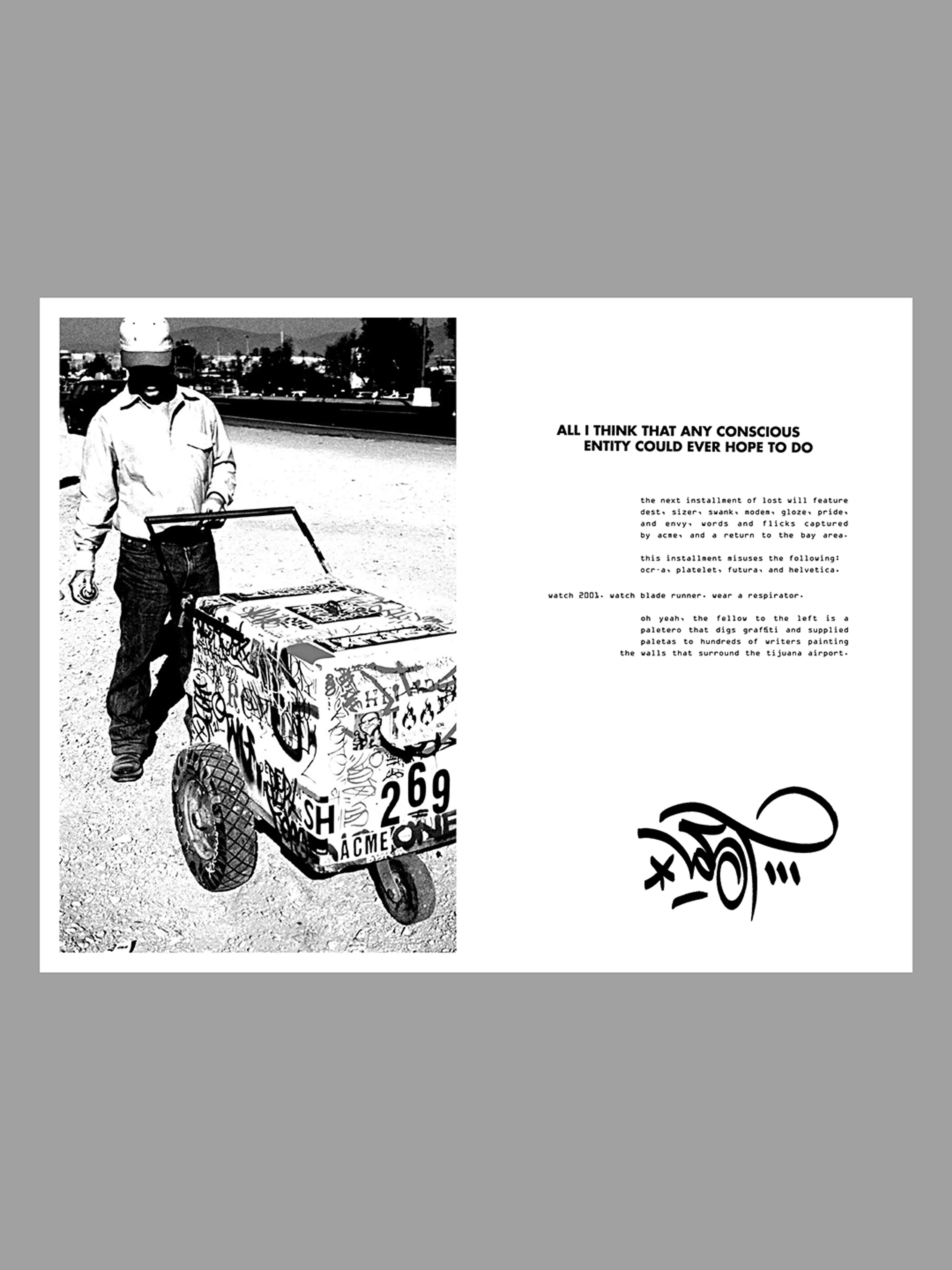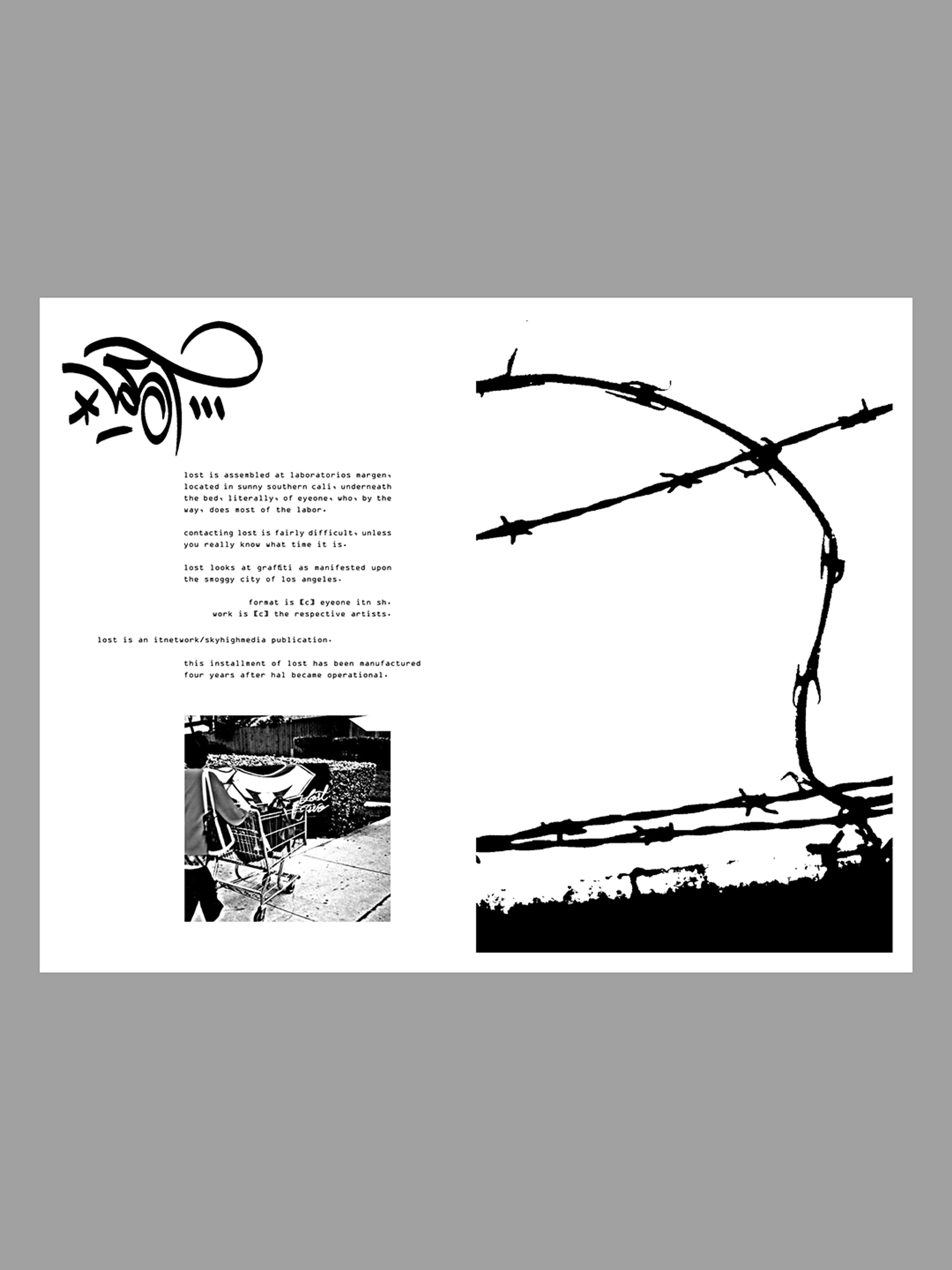 Lost is a DIY graffiti publication started in 1998 by Eyeone in Los Angeles dedicated primarily to the local graffiti movement. This issue from 2001 was designed and art directed by Raymundo T. Reynoso.