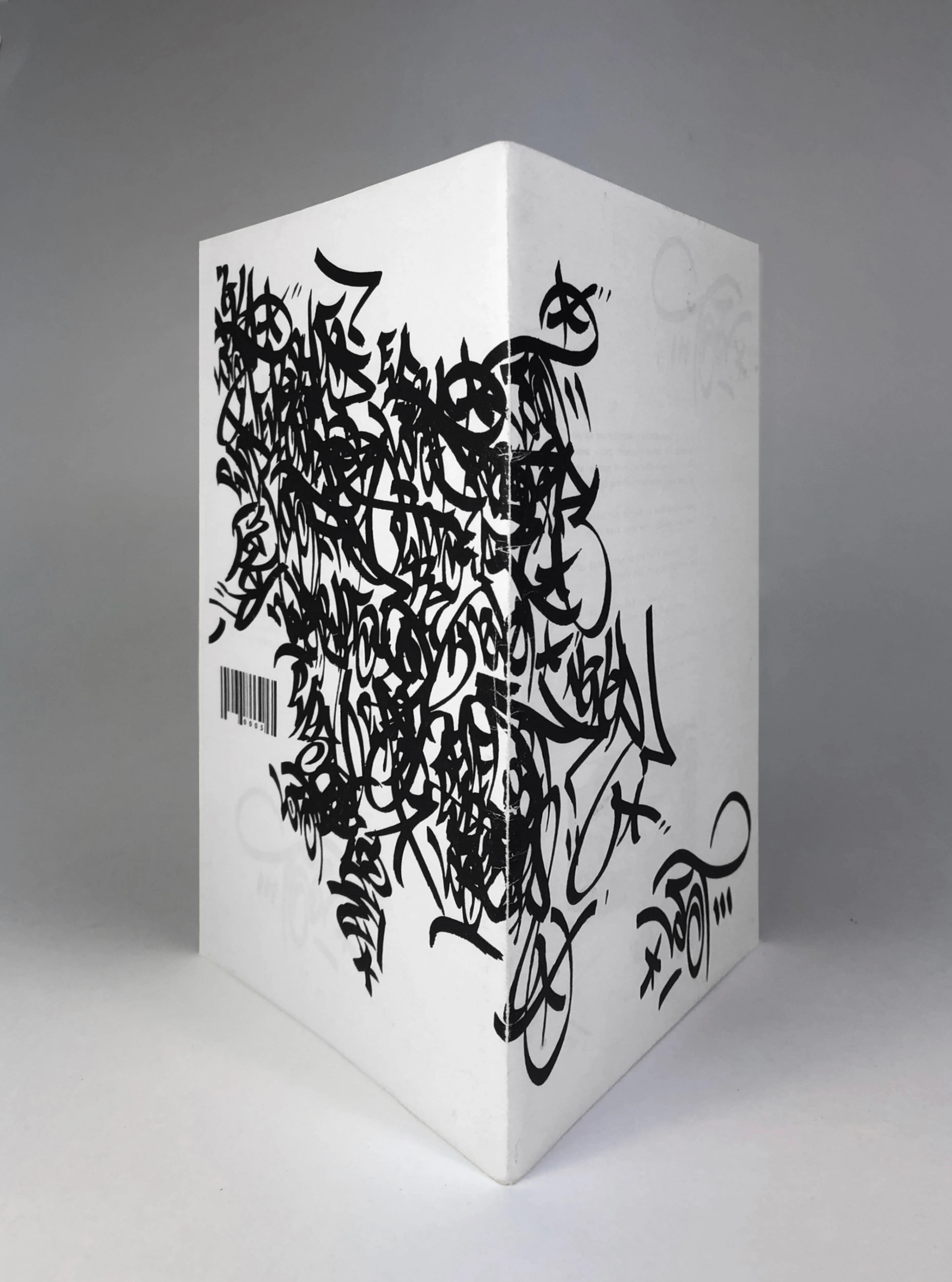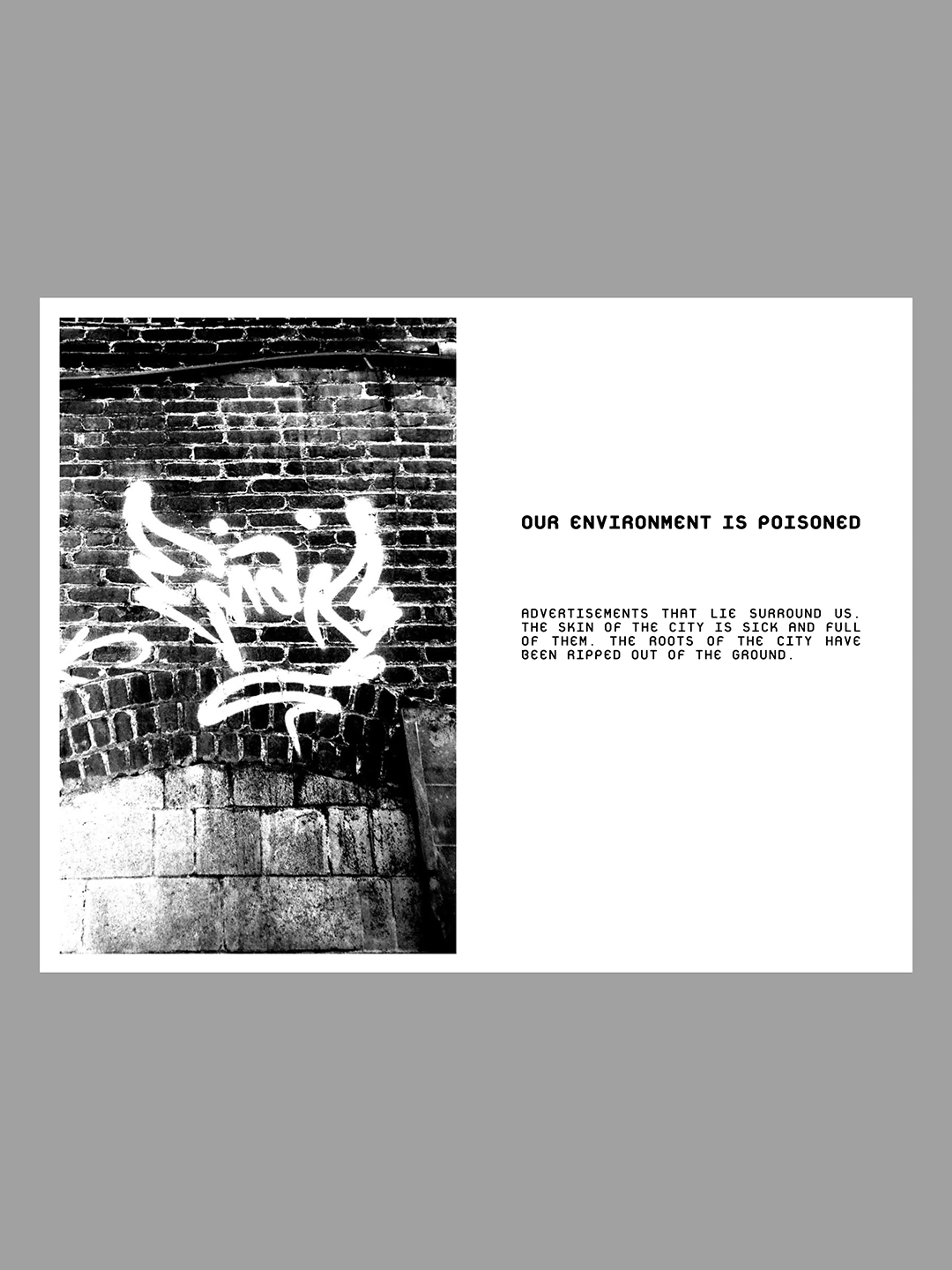It was the cover that caught my eye, as it is meant to, stark black letters falling down the outside cover, from left down to far right, only just being caught in their tumble by the name of the zine. Who knows what would have happened if they’d kept on falling.
