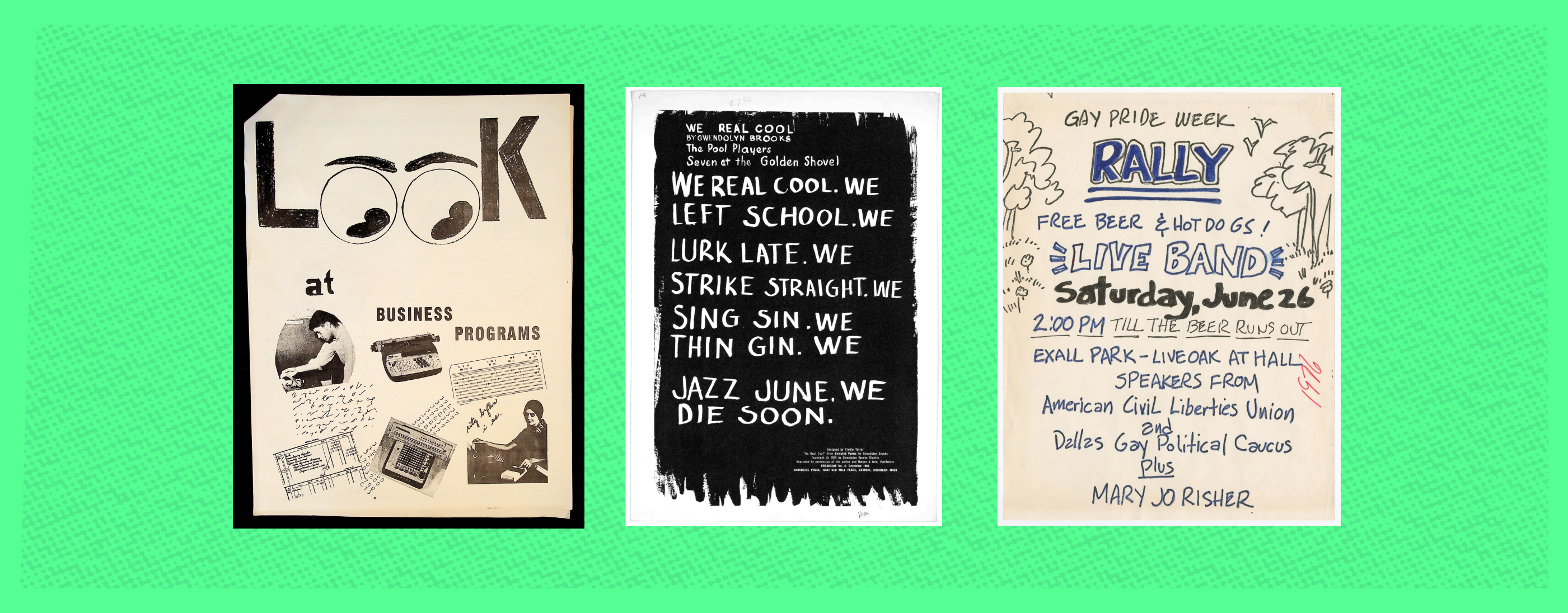 From left to right: Let's Be Snoopy and … (An independent publication (zine) about a business program.), “We real cool” (1966 Broadside No.6 of Broadside Press Broadside Series), and Dallas Gay Pride Week Rally Flyer (1976)