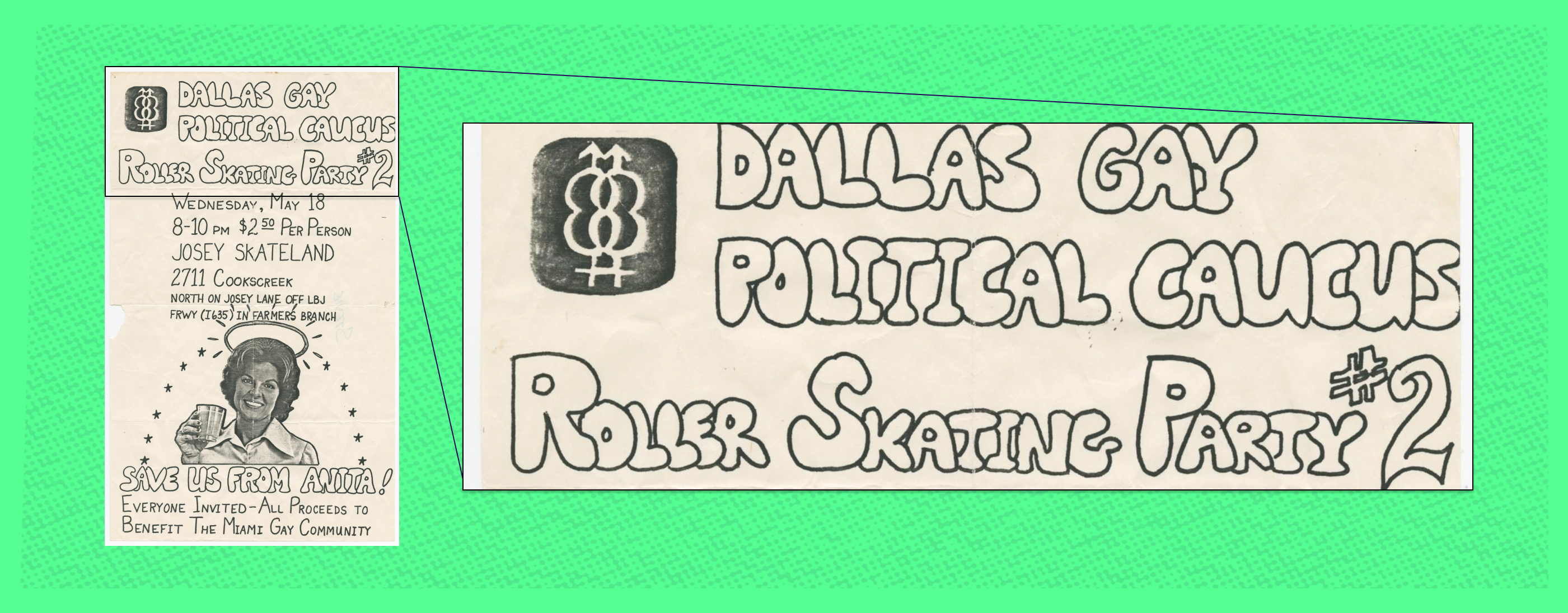 Dallas Gay Political Caucus Flyer | Flyer for a roller skating party hosted by the Dallas Gay Political Caucus on May 18th, 1977 to support the Miami Gay Community after public remarks by Anita Bryant, who was known at the time for her anti-gay statements.