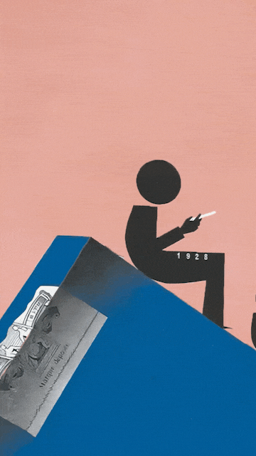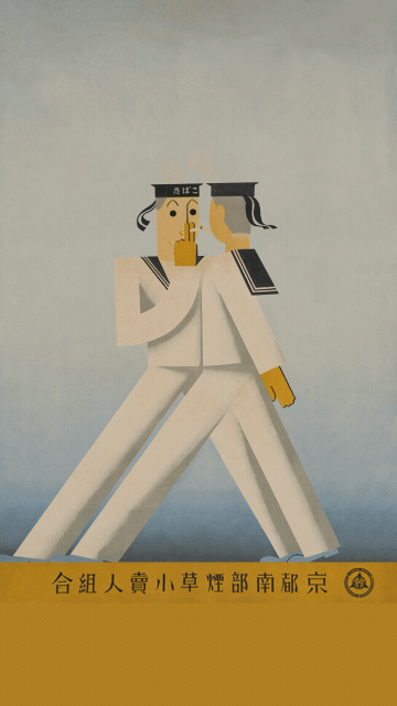 right: Draken Leithead animated a poster of Kyoto Southern Tobacco Retailers Association 1937 “For country, security. For socializing, tobacco”.