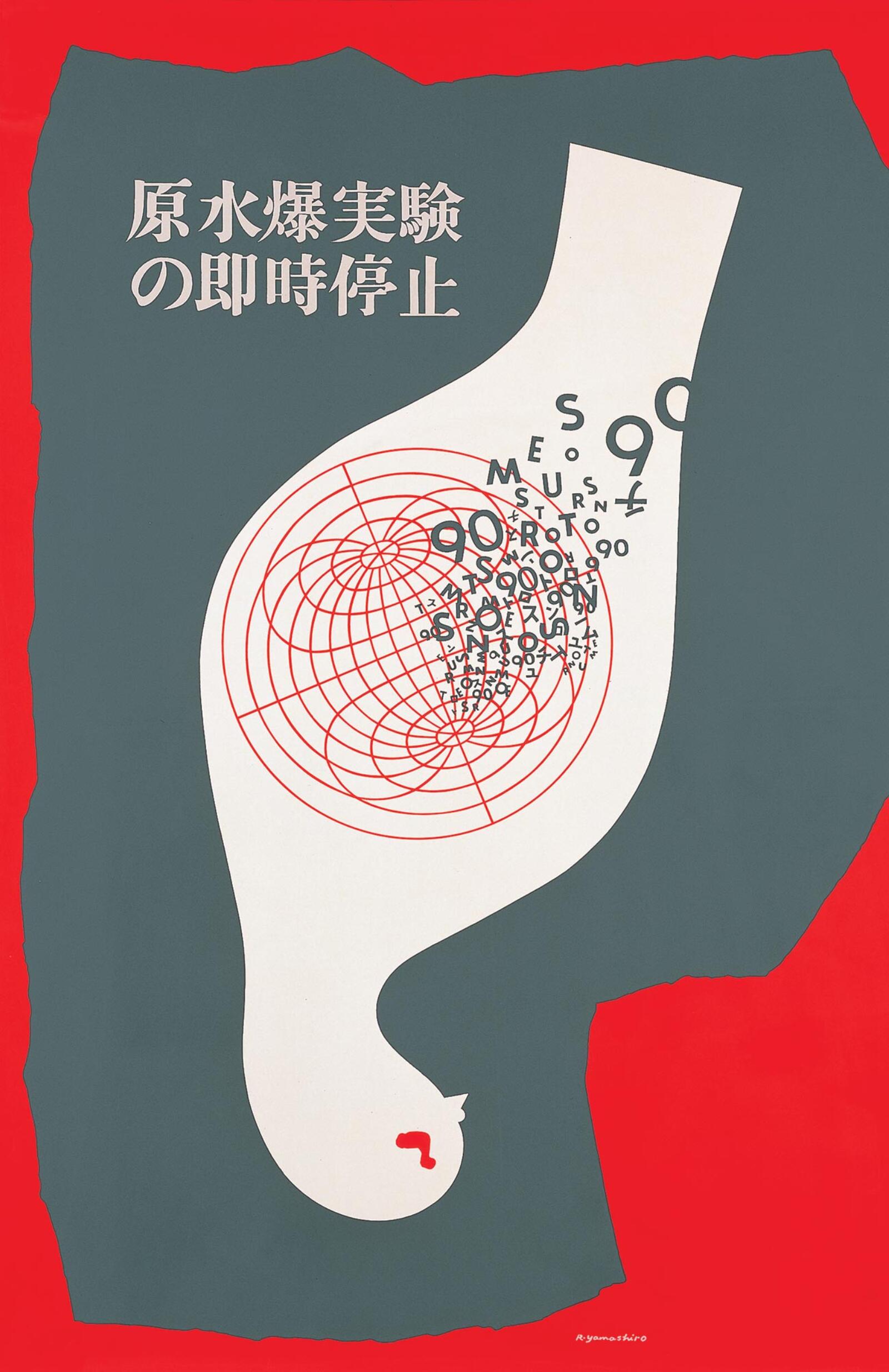 A Japanese protest poster opposing nuclear weapons and testing, this work employs stark symbolism. An inverted or falling white dove with a red tear, enclosing the globe to communicate universal human suffering. Created in 1957 during rising post-war anti-nuclear sentiment, Yamashiro’s piece stands out as a clear example of activist graphic design in Japan.